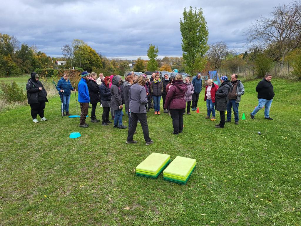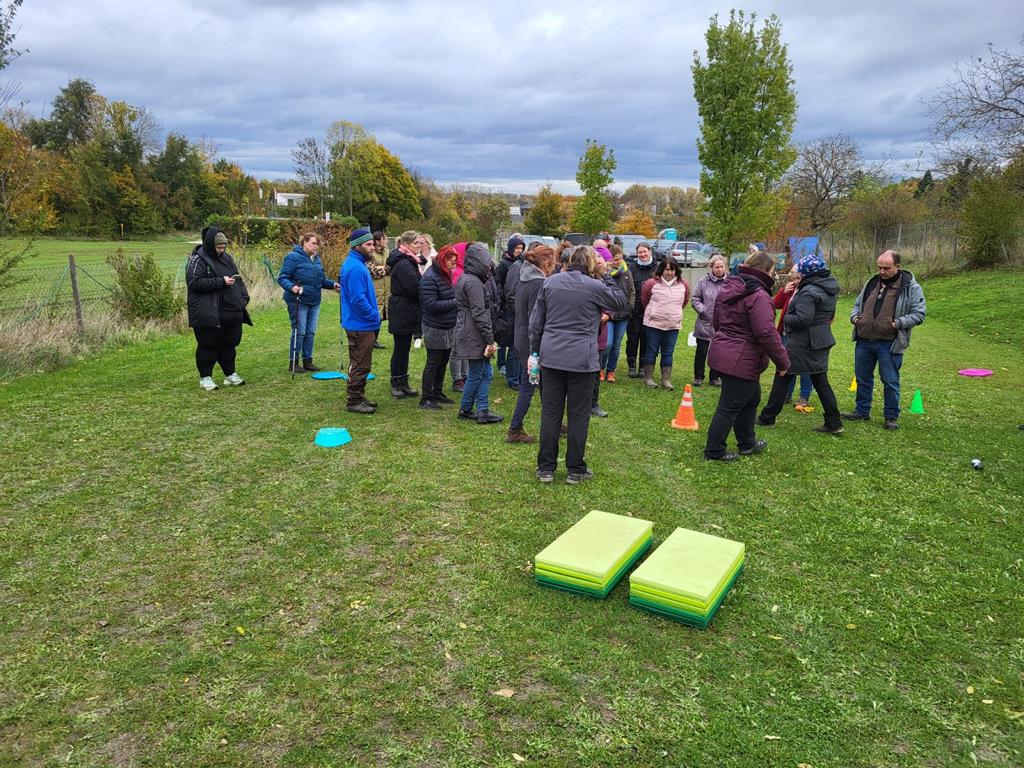 Im anschließenden Praxisteil hatten die Teilnehmer die Gelegenheit, verschiedene Übungen selbst auszuprobieren und miteinander zu erarbeiten. Dabei demonstrierte Anne Hahn unterschiedliche Möglichkeiten, wie ein Training methodisch sinnvoll aufgebaut werden kann, worauf während der Durchführung besonders zu achten ist und wie man Übungssequenzen variabel gestaltet. Die Gruppe zeigte sich äußerst engagiert und es entstand ein lebhafter Austausch unter den Teilnehmenden.